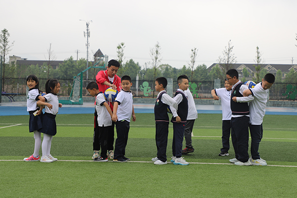 趣味体育活动中,教师教导同学们团结协作,共同完成游戏。