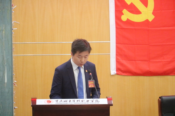 校学生会主席团执行主席范佳宾同学宣读校团委《关于同意重庆城市管理职业学院商学院2021年学生代表大会的批复》,同意我院召开学生代表大会。
