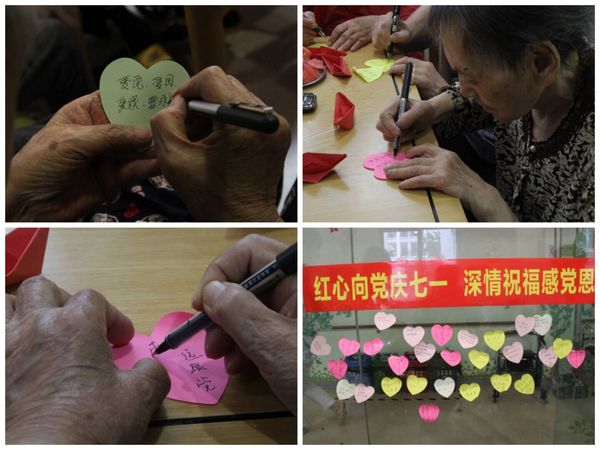 在深情祝福感党恩环节中,老人们怀着激动的心情,围绕“感恩党的关怀,深情祝福祖国”主题争先发言,大家在畅谈中集中体现了感恩,感恩党的英明领导,不仅推翻了封建统治阶级的压迫,让广大农民翻身做了主人,而且带领中国人民从帝国主义的铁蹄下站了起来,自力更生,艰苦奋斗,把中国建成民族独立、人民解放的新中国,不断走向国家富强、民族振兴、人民幸福的康庄大道;感恩党的政策好,从小时候吃不饱饭、衣不暖身、住破瓦房到现在人人不愁吃、不愁穿、不愁住,孩子们也都有学上,这得益于党的政策好。拥有70年党龄的老党员刘婆婆讲到,苦难的童年让自己每天都在饥饿与恐惧中度过,中年时得益于党的关怀,可以边工作边上夜校,读书认字,老年时得益于党的恩惠,可以住在养老院安享晚年,实现老有所依,老有所依,老有所乐。在发言完毕后,大家纷纷拿起笔,在心愿卡上一字一句写下对党的祝福,并贴在心愿墙上,表达对党、对祖国的热爱之情。