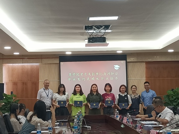 欢送会上,商学院副院长邱云宣读了2021年重庆市优秀毕业以及学校优秀毕业生表彰文件,并为优秀毕业生代表颁发了证书。党总支副书记唐鸿铃宣读了《重庆城市管理职业学院关于聘任高金圆等258名学生为2021届毕业班校友联络员的通知》,并为校友联络员代表颁发了聘书。商学院2021届毕业生共855人,来自7个专业,会与领导为毕业生代表颁发了毕业证书。