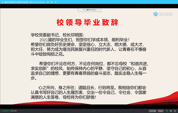 6月26日,智能工程学院2021届学生毕业典礼在云端举行,典礼以“小我融入大我 青春献给祖国”为主题,由智能工程学院党总支书记余光琳主持,身在各地的毕业生们相约云端观看了毕业典礼。