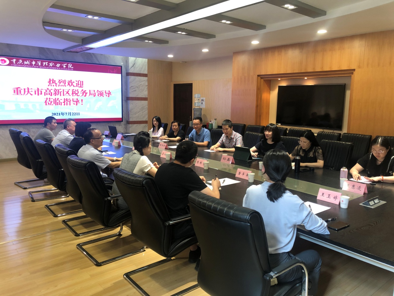 7月22日,重庆市高新区税务局税源管理二科科长蒲晓茂一行7人莅临我校调研交流。我校财务与资产管理处处长刘世兵,财经学院党总支书记谢朝晖、院长孙鑫、副院长黄菊英及数智财金专业群骨干教师参加交流座谈。会议在办公楼第三会议室举行,由孙鑫院长主持。