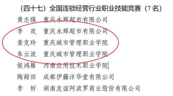 “全国技术能手”是国家技术人才评选表彰制度的重要组成部分,近年来,学校大力弘扬劳模精神、劳动精神和工匠精神,加强建设高素质“双师型”教师队伍,充分发挥职业技能竞赛在技能人才工作中的重要作用,学校师资力量不断增强,人才培养质量不断提升。本次师生同获“全国技术能手”称号,充分展示了近年来我校商学院连锁经营与管理专业建设成果和高技能人才培养成效。专业将以此次奖励为新起点,深入贯彻落实习近平总书记对技能人才工作重要指示精神,以推进“双高”和重庆市高技能人才培训基地建设为抓手,深化办学体制改革和高技能人才培养培训模式改革,推动学校办学质量和服务能力不断提升,努力为培育更多高素质知识型、技能型、创新型劳动者大军作出新的新的贡献。
