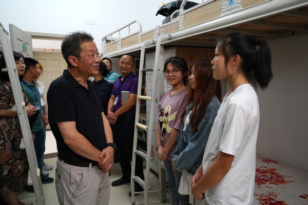 邓明国校长走进春华园三舍,与同学们细致交谈,他耐心与学生交流寝室基本情况以及到校感受,询问对校园环境方面的意见。他对同学们说,要尽快适应大学生活,把握好大学时光,打好基础、加强本领,为未来做好准备;要多与老师、同学交流沟通,争做拼搏实干的奋力前行者,在学习中提升自我素养,在奋斗中追寻理想目标。当了解到有来自市外的同学后,邓校长关切道:“希望同学们尽快适应在重庆的生活,有任何困难及时跟老师沟通,我和老师们都会为大家做好服务”。