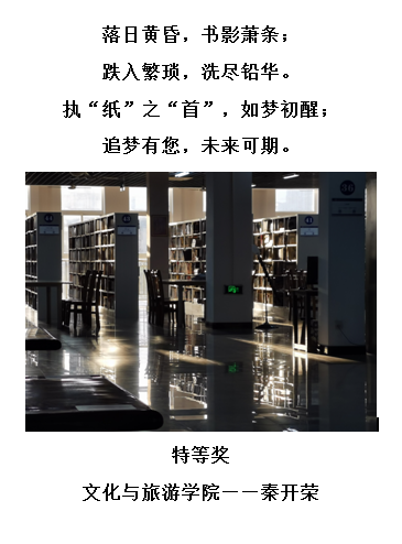 此次活动得到了全校师生的广泛响应和积极参与,收到了以学校图书馆为主题大量的优秀摄影作品。同学们用镜头展现了一个丰富多彩的图书馆美景,充分体现了读者对阅读的喜爱之情,展现了读者对图书馆的热切关注。经过层层筛选和专家公正、公平的评审,21位同学的作品脱颖而出:文化与旅游学院秦开荣获特等奖;文化与旅游学院范晓庆、智慧康养学院杨薇获一等奖;文化与旅游学院罗枫莹、文化与旅游学院周婷婷、智慧康养学院朱元灿获二等奖;商学院黄紫洁、文化与旅游学院熊仪密、智慧康养学院刘彦宏等6位同学获三等奖;文化与旅游学院杨润婵、商学院丁婧、数智财经学院杜薇等9位同学获优秀奖。