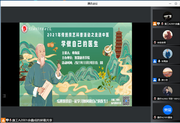 为进一步加强党建引领事业发展,努力推进传统中医药文化教育,11月15日,智慧康养学院通过在线直播的方式开展了“走进中医—学做自己的医生”传统技艺科普活动。活动邀请了重庆医药高等专科学校中医学院申海滨老师作为活动主讲。本次活动面向智慧康养学院康复治疗技术、护理、智慧健康养老服务与管理等相关专业学生,参与在线直播的师生人数近700人。