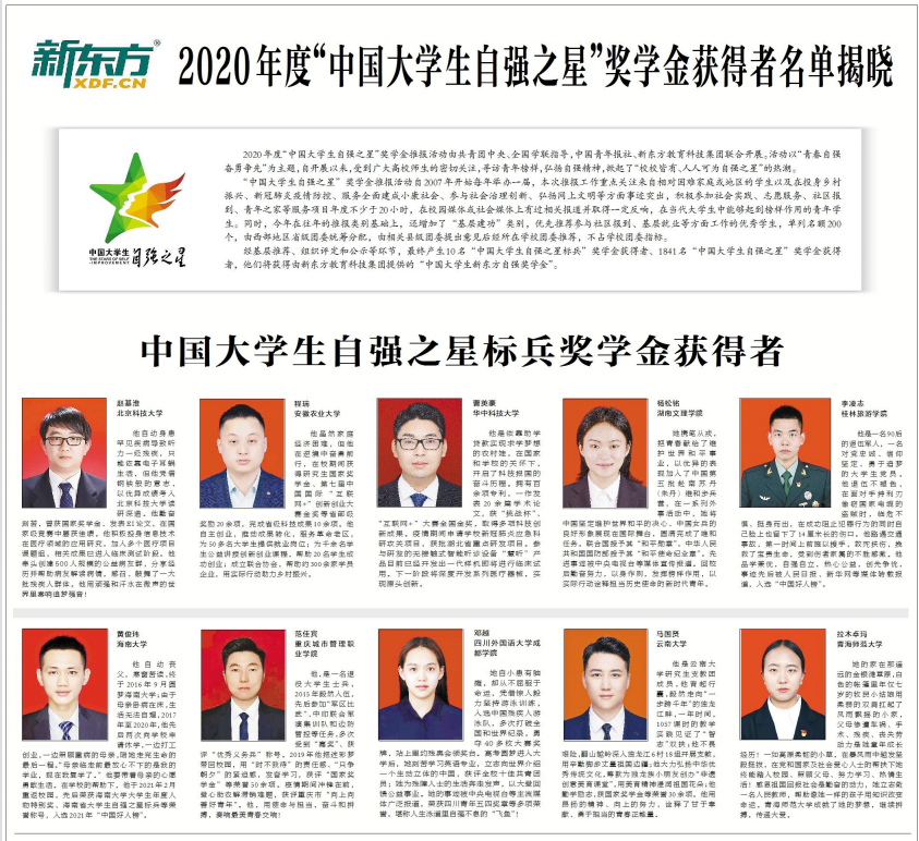 日前,由共青团中央、全国学联指导,中国青年报社联合开展的2020年度“中国大学生自强之星”奖学金推报活动中,我校数智财经学院2019级范佳宾、智能工程学院2018级余雄伟同学分获“中国大学生自强之星标兵”和“中国大学生自强之星奖学金”称号。其中,范佳宾同学系10名“中国大学生自强之星标兵”中唯一的高职学生代表。