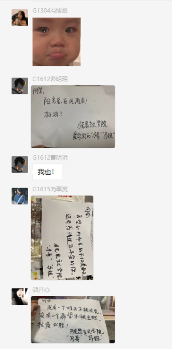 同学们看到后表示非常感动,纷纷在宿舍群留言“抗疫必胜,城管加油”,一句句鼓励,一声声加油,是同学们内心最真诚的祝愿和期盼。重庆城管院学子们请放心,“马哥马姐”上下一心时刻与你在一起!“马哥马姐”们相信,站好每轮岗,守护好每位同学,必会迎来胜利的曙光,“病毒无情,我们有爱,曙光在前,我们必胜!”