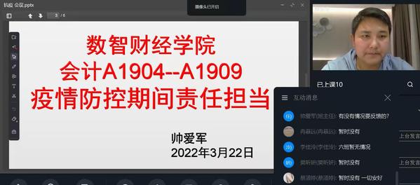数智财经学院高度重视网络阵地的宣传引导,充分利用新媒体召开线上动员会、主题班会、团日活动等,帮助学生树立正确的疫情认识观、防控观。同时辅导员、班主任老师们还通过网络了解隔离学生的健康状况、实时动态、所在位置等,及时进行心理疏导,解决学生实际生活困难,有效夯实了疫情防控工作的基础。
