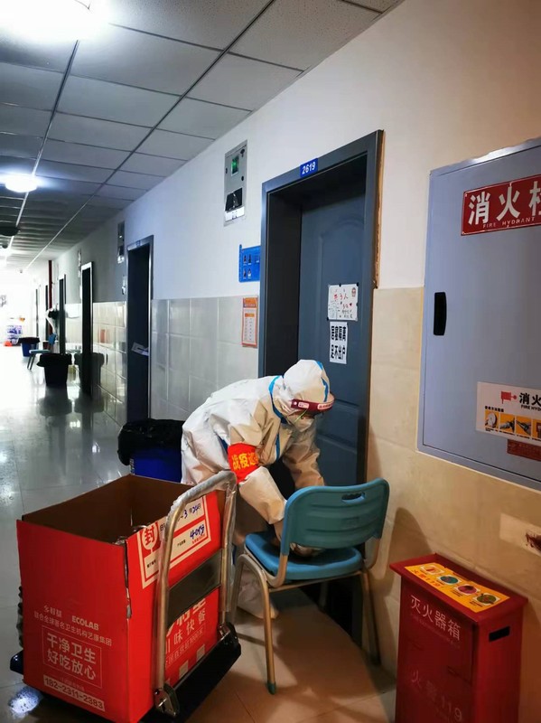 基于送餐工作的艰难,学校领导也在不停地想办法。从3月19日开始,学校在各个公寓楼安装了吊机,送餐工作强度得到很大程度的缓解。因吊篮里的食物有几十斤的的重量,帮助学生社区送餐的男老师们,自觉承担了吊篮接运的工作。当吊篮里的食物送上楼后,女老师开始有序地分发食物。大家这样密切地配合着,送餐效率大大提高了,送餐时间也缩短了很多。