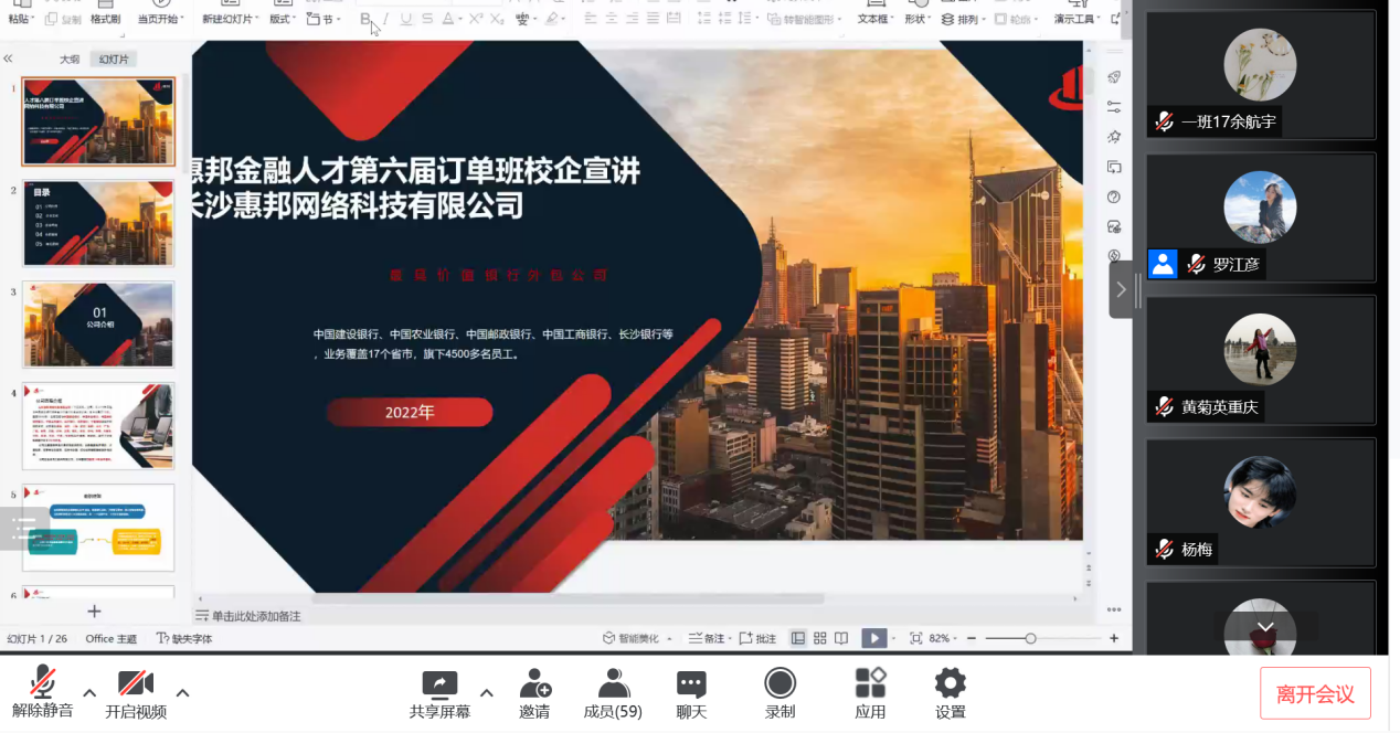 疫情防控期间,为深化校企合作及人才培养力度,拓宽数智财经学院学生实习和就业渠道,增强同学们对后期就业方向的认知,3月29日,数智财经学院通过腾讯会议召开第六届惠邦金融人才订单班校企宣讲会。数智财经学院黄菊英副院长、金融服务与管理专业带头人王惠凌、教研室主任廖飖霏、长沙惠邦网络科技有限公司人事总监罗江彦及金融服务与管理、大数据与会计、大数据与财务管理专业的一百余名同学参加。会议由订单班班主任董倩主持。