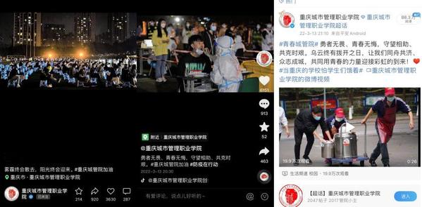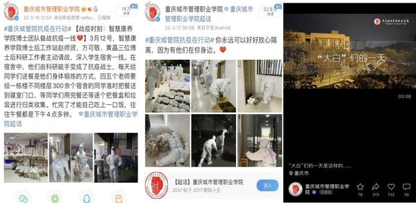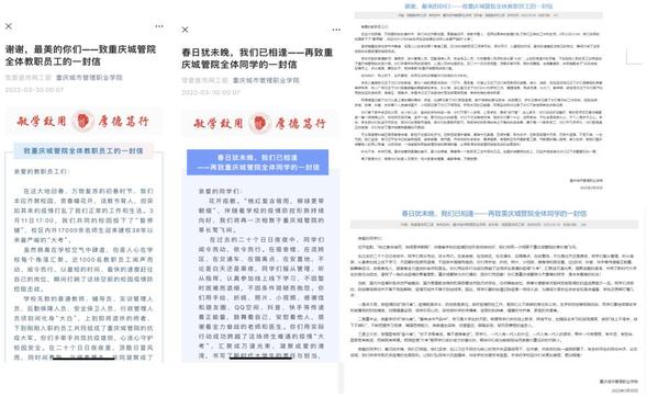 学校疫情防控等级降低后,第一时间在校园官网以及各社交媒体平台发布《春日犹未晚,我们已相逢——再致重庆城管院全体同学的一封信》《谢谢,最美的你们——致全体教职员工的一封信》。