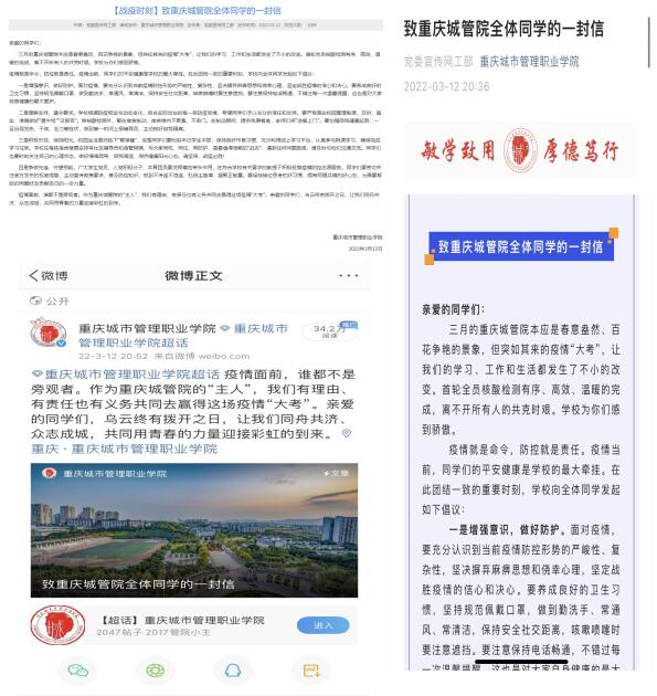 学校通过校园官网、官方微信和微博及时发布《致重庆城管院全体同学的一封信》。该文在微博的阅读量达34.2万次,互动次数达483次;微信推文阅读量达5.2万次,互动量达1321次。