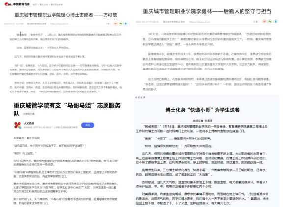 学校主动与新华社、央视新闻、光明日报、新华网、重庆日报、重庆卫视、华龙网、重庆发布、上游新闻、重庆广电第1眼新闻、天天630、重庆交通广播、中国教育在线等主流媒体联系,宣传报道抗疫一线人物典型事迹21个,如《博士化身“快递小哥”为学生送餐》《重庆城管院有支“马哥马姐”志愿服务队》《重庆城市管理职业学院李勇林——后勤人的坚守与担当》《重庆城市管理职业学院暖心博士志愿者——方可敬》等引发社会关注,赢得师生和网友的点赞。疫情期间共计在主流媒体推送外宣102篇,其中新华社发布3篇、央视新闻发布1篇、光明日报发布1篇、学习强国转载2篇、光明网转载1篇。