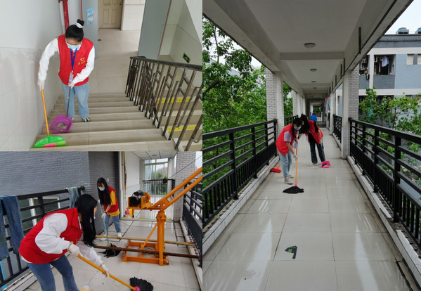 疫情当前,校园环境卫生不容忽视,志愿者们主动请缨,自行准备了清理工具,对宿舍楼栋的公共区域包括楼梯、宿舍走廊、栏杆等全面进行整理清洁。每层长长的廊道都穿梭着同学的身影。整个过程中,同学们积极配合,认真细致,不怕脏、不怕累。通过大家的努力,宿舍公共区域焕然一新,一扫而净。