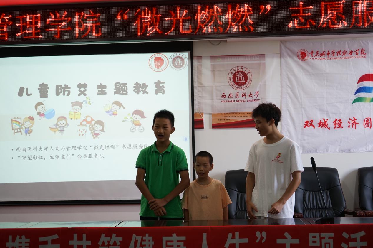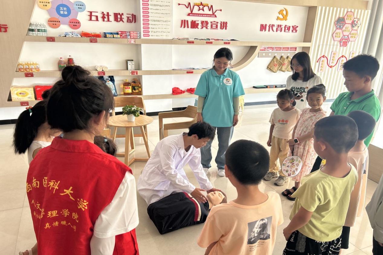 为贯彻党中央、国务院关于成渝地区双城经济圈建设的战略部署,统筹做好川渝毗邻地区合作共建和一体化发展的建设服务工作,促进双城地区城乡儿童教育体系建设,7月9日,由民政与社会治理学院新时代文明实践团联合西南医科大学社会实践团组成的双城经济圈建设研学团高扬科普旗帜,在重庆市江津艾坪社区开展了“守护青苗·点亮心灯”生命教育主题系列活动,为城乡困境儿童科普生命健康知识、演示急救操作。