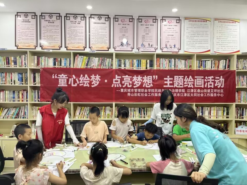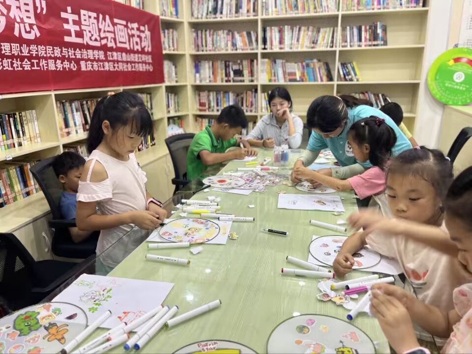 7月9日,民政与社会治理学院新时代文明实践团在重庆江津艾坪社区开展了“童心绘梦·点亮梦想”主题教育活动。本次活动采用团扇绘画的形式,引导儿童画出心中的美好瞬间,用画笔描绘温情,鼓励儿童展示自我、勇敢追梦。