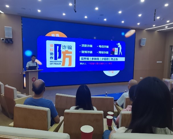 中国银行高新分行的熊恒主任结合大学生实际情况,围绕“电信诈骗、贷款诈骗、赌博诈骗、网络诈骗”分别阐释其来源、分析案例如何防范等方面进行宣讲。强调防诈骗要做到“六个一律”即只要陌生人一谈到转账,一律挂掉;只要一谈到中奖了,一律挂掉;只要一谈到“电话转接任何执法机构”的,一律挂掉;所有短信,让我点击链接的,一律删掉;微信不认识的人发来的链接,一律不点;一提到“安全账户”的一律是诈骗。“八个凡是”即凡是自称任何执法机构要求汇款的,凡是叫你汇款到“安全账户”的,凡是通知中奖、领奖要你先交钱的,凡是通知“家属”出事要先汇款的,凡是在电话中索要银行卡信息及验证码的,凡是让你开通网银接受检查的,凡是自称你的老板或者领导要求汇款的,凡是陌生网站要登记银行卡信息的,一律不予理睬。