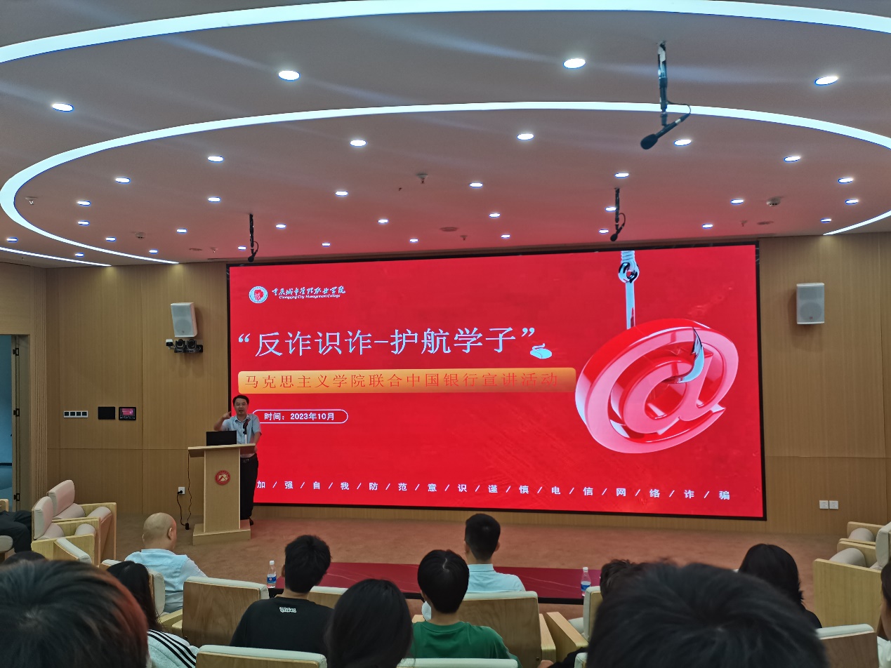 为增强新时代大学生的反诈防骗意识,营造安全健康的网络环境,10月17日,马克思主义学院联合中国银行高新分行在学院学术报告厅开展“反诈宣传进校园 共筑青春防护网”宣讲活动。学院党总支书记喻永均,学生工作相关人员和2023级全体学生参与活动。