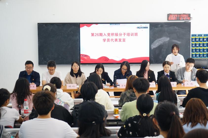 随后,学员代表朱阳涵玉同学发言。她认为,作为入党积极分子,应严以律己、自我完善,自觉把个人追求融入到实现两个一百年的宏伟目标中,将自己锻炼成符合党和人民期望的合格社会主义建设者和接班人。