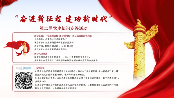 为学习贯彻习近平新时代中国特色社会主义思想,落实思政课立德树人关键课程的铸魂育人功能,推动党史学习教育常态化制度化,进一步夯实“大思政”工作格局,更好地激发全校师生的历史责任感和使命感,11月28日,马克思主义学院党总支举行“奋进新征程 建功新时代”第二届党史知识竞答活动。本次活动由马克思主义学院党总支主办,形策和纲要教研室联合党支部承办,共计吸引师生1200余人参加。
