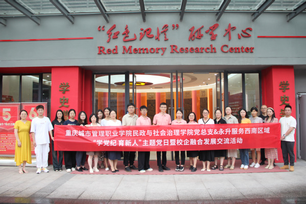 为深入学习贯彻习近平新时代中国特色社会主义思想,激发党员爱国情怀,增强党员党性修养和思想政治觉悟,进一步深化校企双方沟通交流,推动产学一体化发展,构建党建统领的协同育人机制,民政与社会治理学院党总支、永升服务西南区域公司于6月18日开展“学党纪 育新人”主题党日暨校企融合发展交流活动。活动分两个阶段,第一个阶段参观学校红色记忆研学中心,第二个阶段座谈交流。永升服务集团西南区域公司人力资源副总监张琳,人力资源经理、支部宣传委员白耘灿,市场发展资深主管、支部组织委员周江平,经营高级专员、支部书记周建琼,民政与社会治理学院党总支副书记李国英,党总支宣传委员王伟,民政专业党支部书记刘慧玲,党支部统战宣传委员颜台钊,二十余名师生党员参与主题党日。