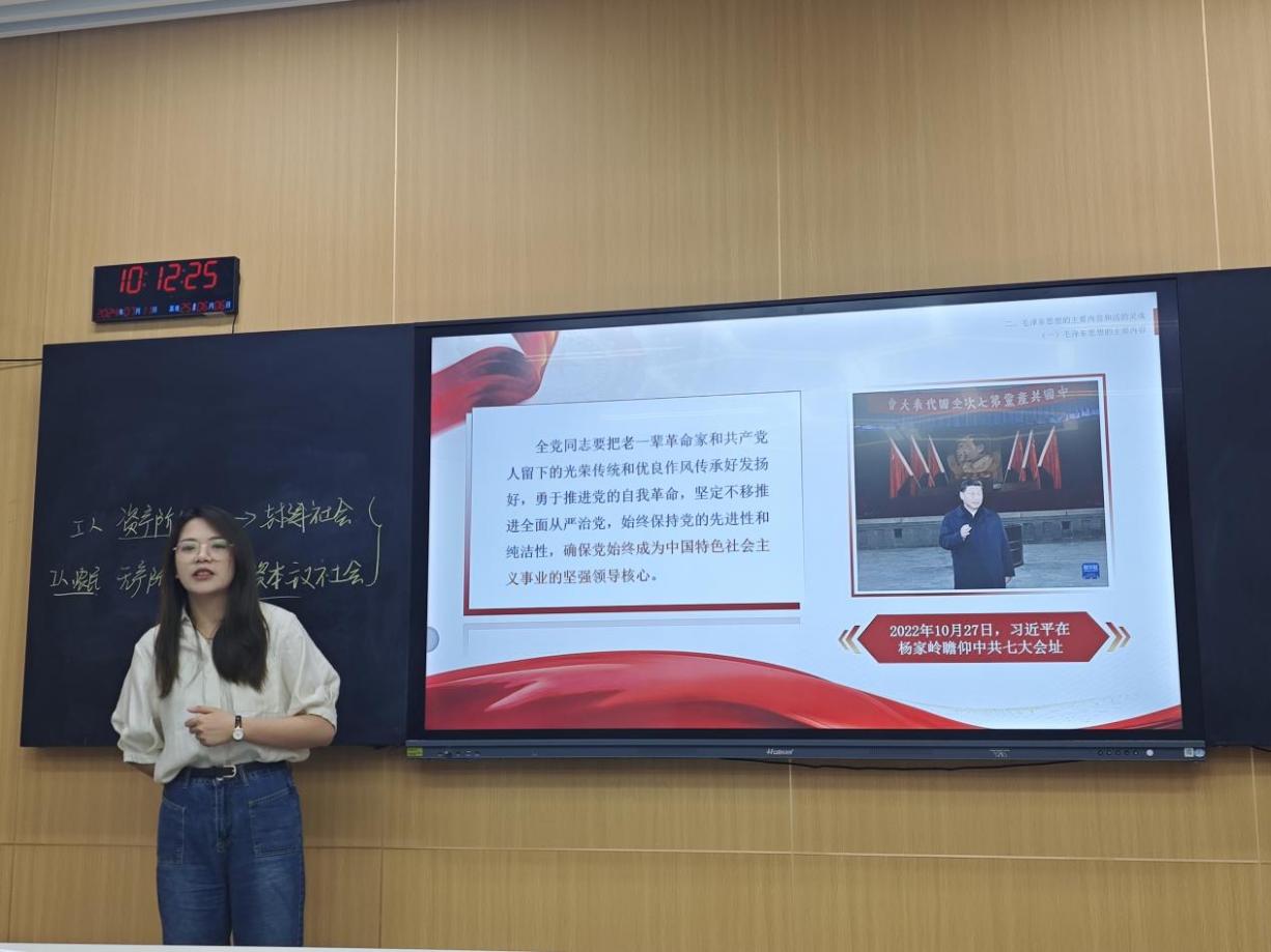 陈文瑶老师以“毛泽东思想及其历史地位”为课堂主题进行了精彩的教学讲授。在40分钟的教学中,陈老师结合学生专业特点、融入毛泽东诗词,从毛泽东思想的形成、发展、内容及历史地位等方面进行了深入浅出的教学。老师们纷纷表示,这堂示范课深刻阐述了毛泽东思想的丰富内涵与历史意义,展现了毛泽东思想的独特魅力,让学生深刻理解了毛泽东思想在中国革命和建设中的不可替代作用,同时又深化了学生对毛泽东思想的理解,增强了文化自信与历史自觉;是一堂坚持了“八个统一”的思政课“金课”。