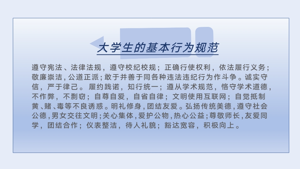 杨飏介绍了重庆城市管理职业学院的校史校情,让同学们知晓了学校的发展历程,然后他对马克思主义学院的院史院情进行了重点介绍,让同学们了解了学院成立之初的艰辛、发展到今天的不易、面向未来的从容与坚定。接着,张媛艺介绍了学校的章程及校规校纪,让同学们明确了学校章程的制定对学校的重要作用和意义,知晓了遵守校规校纪对于大学生全面发展的要求及规范。