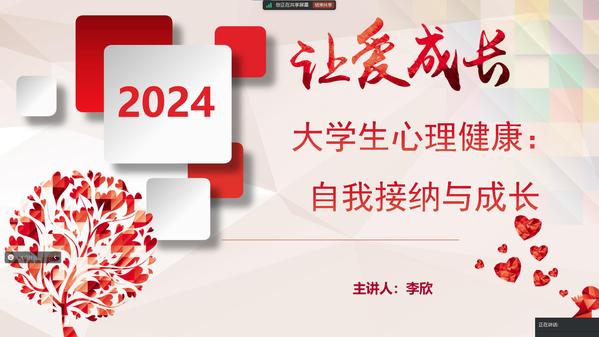 心理健康及适应教育。“新式幸福”积极心理培育辅导员工作室李欣老师以“让爱成长”为主题,有针对性地宣传心理健康知识和心理问题调适求助方法。开展新生适应教育,帮助新生尽快实现从中学到大学的心理转变和角色转变,确立大学发展目标。