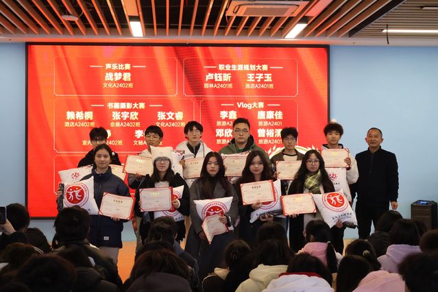 12月10日,文化与旅游学院和通识教育学院“红梅花儿开”科技文化艺术体育活动闭幕式暨迎新活动在荣昌校区海棠餐厅隆重举行。荣昌校区管委会有关负责同志,文化与旅游学院班子成员以及2024级辅导员参加活动,并为获奖选手和班级颁奖。