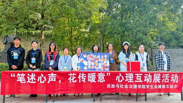 为积极响应《全面加强和改进新时代学生心理健康工作专项行动计划(2023—2025年)》,进一步营造关注心理健康的校园氛围,11月4日,民政与社会治理学院在敏学楼广场成功举办“笔述心声 花传暖意”主题心理互动展。本次活动由学院生命教育辅导员工作室“蒲公英爱心社”与学生会健康互助部共同举办,以“表达即疗愈,互动即关怀”为理念,吸引了468名学生积极参与,成为秋日校园中一道温暖而亮丽的风景。