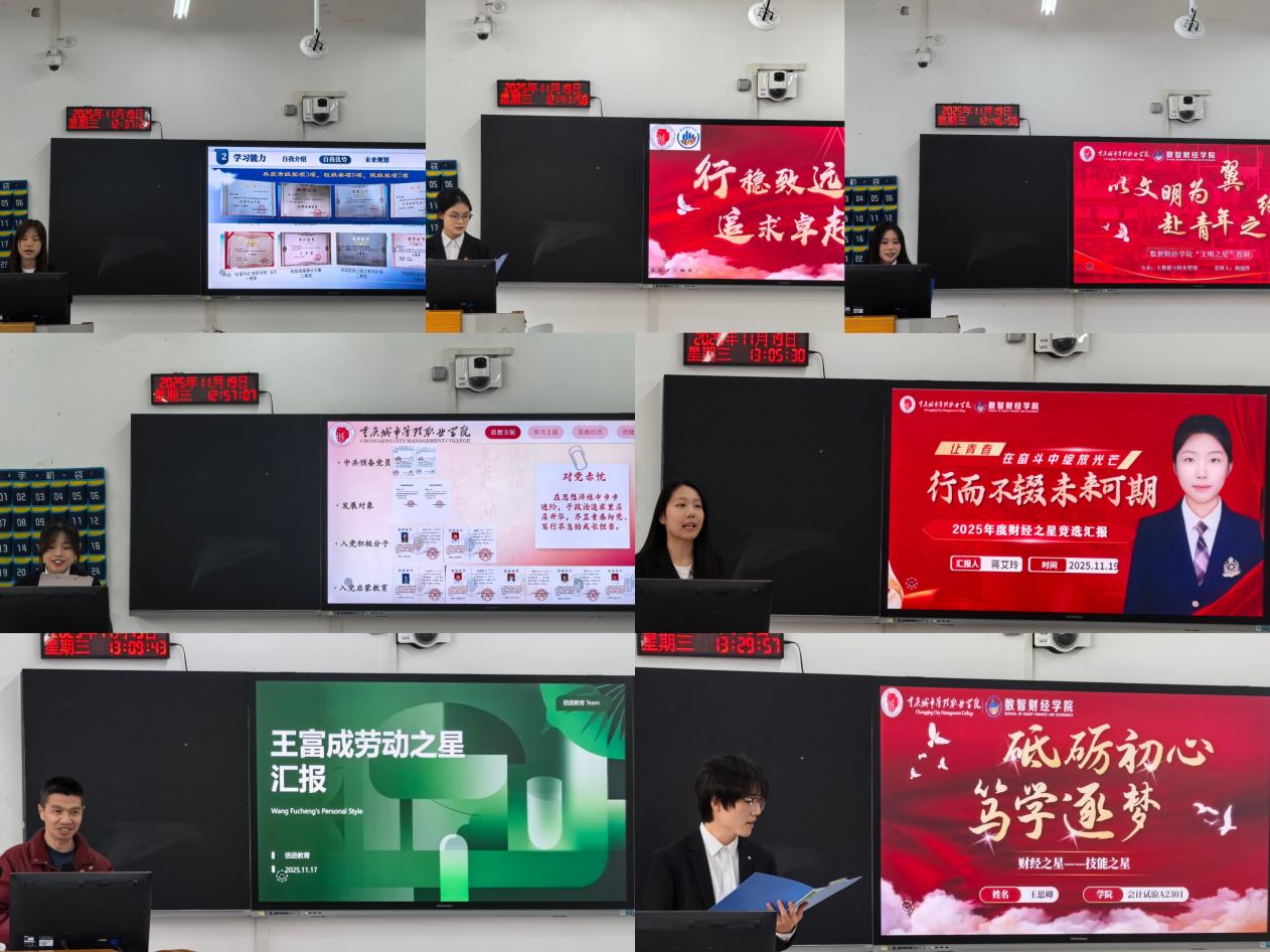 “财经之星”评选活动旨在全方位发掘和表彰在学业发展、技能锤炼、志愿服务、实践创新、体育竞技、文艺创作等领域表现突出的优秀学子,进一步营造了“学习榜样、崇尚榜样、争当榜样”的浓厚校园氛围。评选前期,经过自主申报、资格审查、院级初选,一批综合素质过硬、事迹典型鲜明的候选人进入最终的现场答辩环节。答辩现场气氛热烈,各位候选人依次登台展示。他们以精心打磨的PPT为载体,结合自身成长历程娓娓道来,从学业上的深耕不辍到技能方面的精益求精,从品德修养的躬身践行到劳动实践的责任担当,全方位展现了突出实绩与综合素养。候选人们自信从容的台风、扎实丰硕的成果、积极向上的精神风貌,深深感染了现场每一位师生,赢得阵阵掌声与高度赞誉。