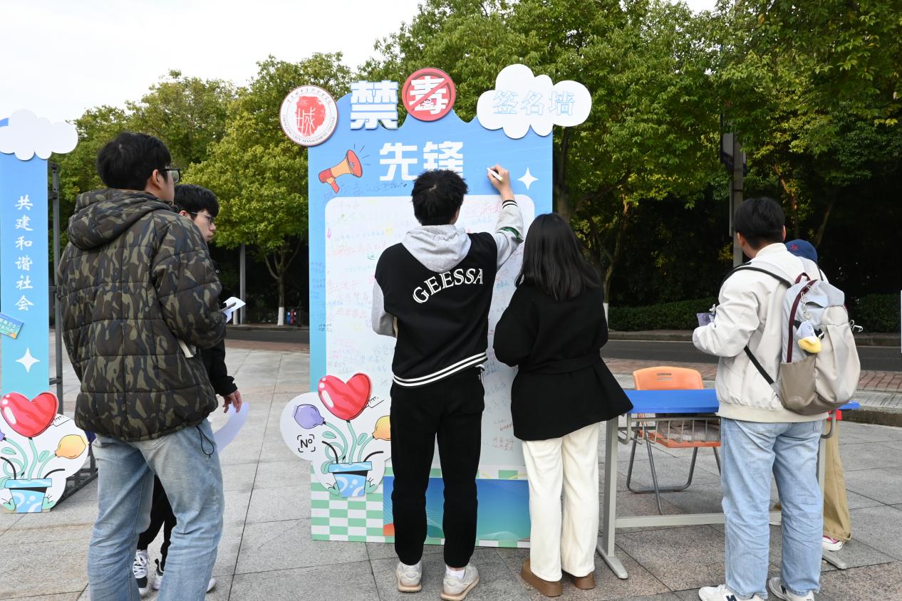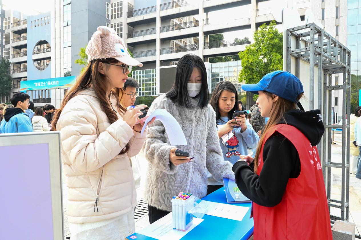 与此同时,敏学楼广场的“青春不‘毒’行健康伴我行”闯关赛同样热度高涨。“投球识毒品”“毒品拼词战”“缉毒小能手”等特色环节,将毒品种类识别、危害认知等内容转化为趣味挑战。同学们在闯关过程中,通过实物联想、知识比拼等方式,认清了新型毒品的隐蔽性与危害性,进一步筑牢了“珍爱生命、远离毒品”的思想防线,现场丰厚奖品的设置更激发了大家的参与热情。
