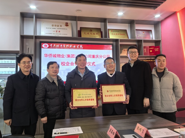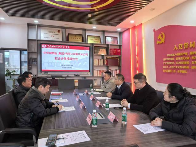 最后,周良才与王丕互相赠牌,正式开启了我校与华侨城物业(集团)有限公司重庆分公司的合作关系。双方将在专业设置与岗位能力开发方面,精准对接市场需求,优化专业课程体系;在人才培养方案改革与实施上,创新教学模式,提升人才培养质量;在就业服务与指导领域,为学生提供更多优质的就业机会和职业发展建议;在科技创新与成果推广方面,共同开展科研项目,推动行业技术进步;在继续教育与培训方面,为员工提供持续学习的平台,提升行业整体素质。