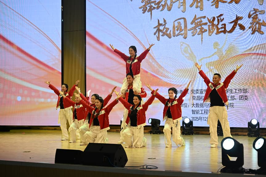 为丰富校园文化生活,彰显青年学子青春活力,提升校园文化风采,12月14日,由党委宣传部、党委学生工作部、荣昌校区管委会学工部、校团委主办,大数据与信息产业学院和智能工程学院共同承办的2025年“悦美青春”校园文化艺术节系列活动之“舞动青春,聚力同行”校园舞蹈大赛在学术交流中心多功能厅精彩收官。全校各二级学院的10支参赛队伍同台竞技,用灵动舞姿诠释青春内涵,为现场师生呈现了一场视听盛宴。