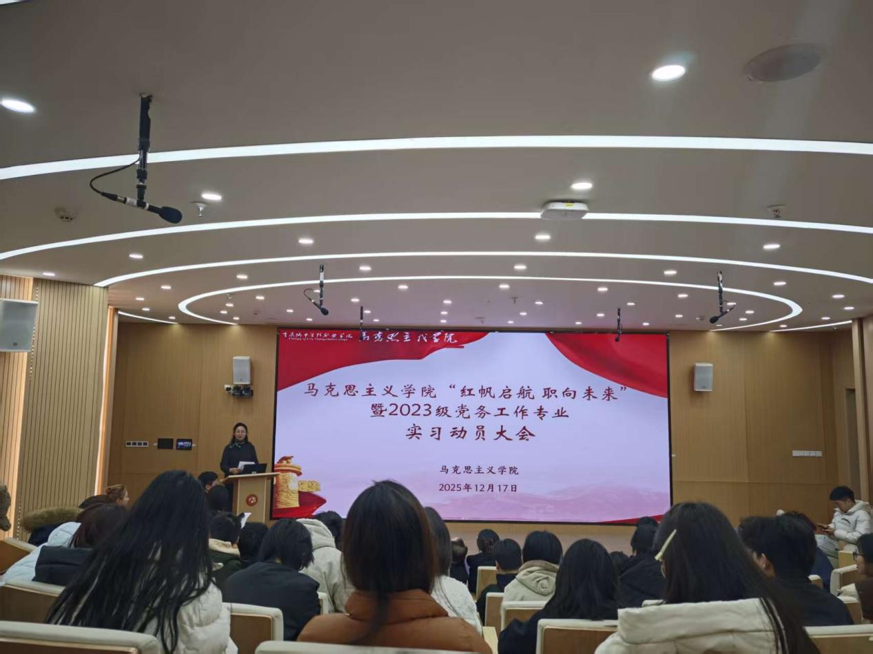 为严格落实专业人才培养方案,扎实推进实践教学计划落地,切实做好实习就业指导工作,12月17日,马克思主义学院在学院学术报告厅举行“红帆启航 职向未来”暨2023级党务工作专业实习动员大会。学院院长杨飏、副院长张媛艺,教研室主任、党务工作专业带头人、实习指导教师、辅导员及学院全体学生参会。会议由张媛艺主持。