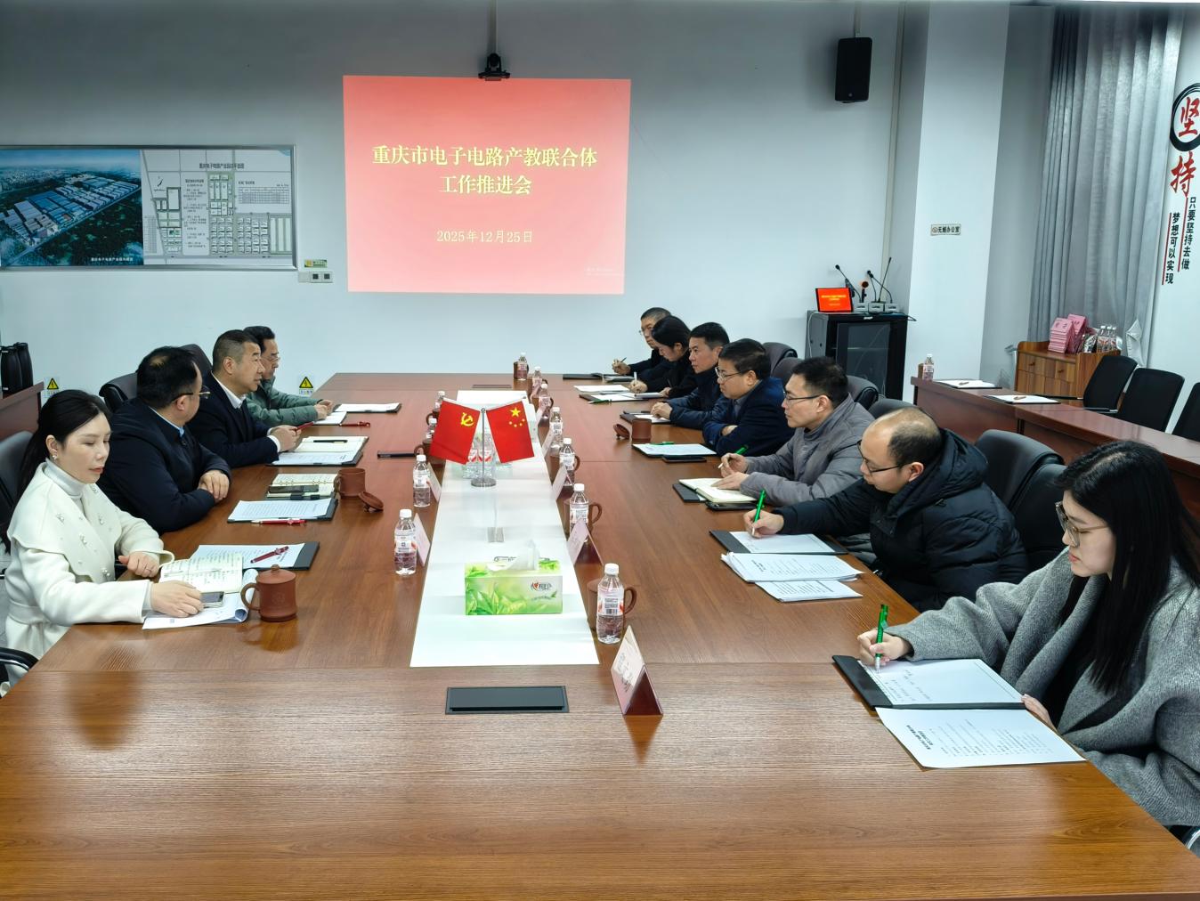 为深入落实“访企拓岗促就业”专项行动要求,深化产教融合、精准对接企业人才需求,12月25日,学校党委副书记、校长邓明国带队赴重庆电子电路产业园,与荣昌高新区、重庆市瑜瀚电子科技有限公司共同召开重庆市电子电路产教联合体工作推进会,以政企校协同联动拓宽就业渠道、优化人才培养路径。学校党委委员、副校长彭勇及荣昌校区管委会、智能工程学院、产教融合中心等相关人员参会。