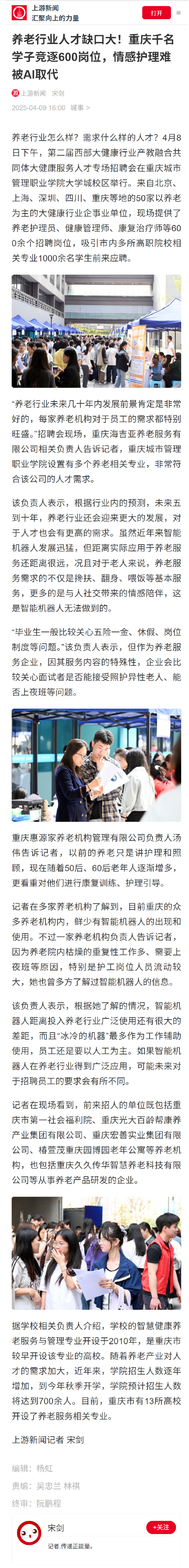 [上游新闻]养老行业人才缺口大!重庆千名学子竞逐600岗位,情感护理难被AI取代