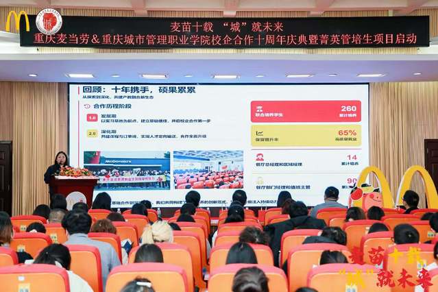 1月9日上午,“麦苗十载,‘城’就未来”——我校与麦当劳(重庆)公司校企合作十周年庆典暨菁英管培生项目启动仪式在学校举行。中国连锁经营协会、麦当劳特许经营商(海印集团)、麦当劳(中国)及重庆市场的领导与嘉宾,学校党委委员、副校长刘幼昕,商学院、教务处、产教融合中心相关负责人、师生代表及历届“麦苗班”杰出学员代表齐聚一堂,共同回顾十年携手育人的丰硕成果,擘画产教融合新蓝图。