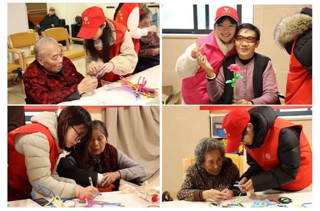 考虑到老年人的操作习惯,志愿者们采用“一对一”贴心陪伴模式,与老人围坐在一起,耐心分解每一个步骤。遇到手指不太灵活的老人,志愿者们便弯下腰,手把手地带着他们绕圈、固定。在轻柔的指导和鼓励声中,一根根普通的扭扭棒在老人们手中逐渐变成栩栩如生的花瓣。现场欢声笑语不断,老人们专注的眼神和志愿者们青春的笑脸交织成一幅温馨画面。