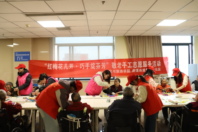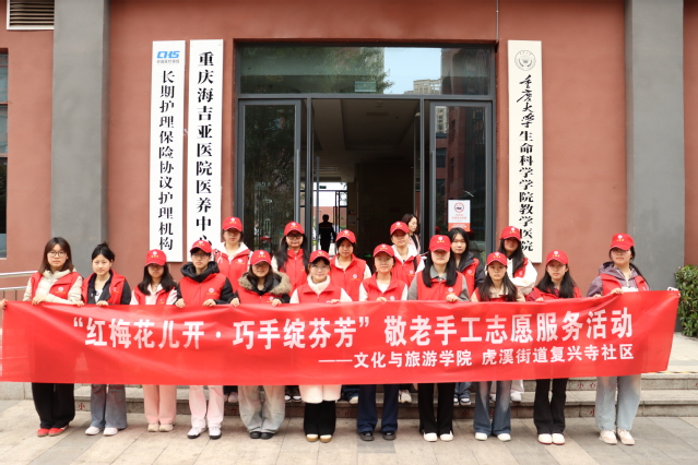 为积极践行“智慧老龄化”建设理念,丰富老年朋友的精神文化生活,3月5日,文化与旅游学院“红梅花儿开”志愿服务队携手虎溪街道复兴寺社区工作人员走进重庆海吉亚医院医养中心,开展“红梅花儿开·巧手绽芬芳”敬老手工志愿服务活动,用创意手工与暖心陪伴,为医养中心的爷爷奶奶们送去春日里的独特关怀。
