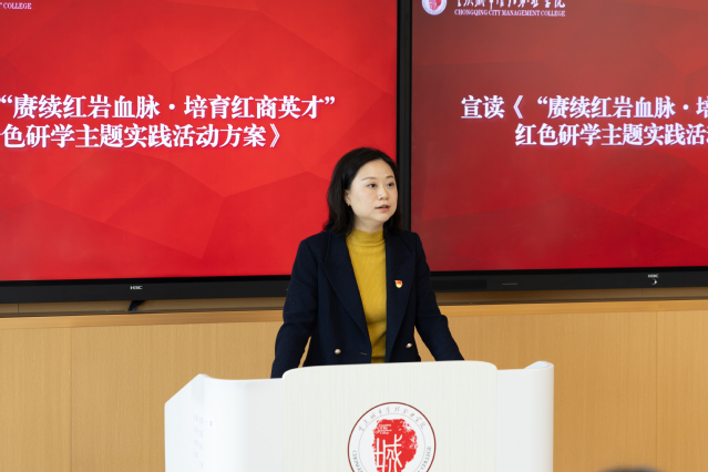 牟艳红宣读了活动方案。本次主题研学活动将充分利用重庆丰富的红色资源,围绕“读、讲、算、辩、访、创、诺”七大主题,设计“红商微行动”系列矩阵,以“微学习、微推演、微创作、微服务”等生动形式,让同学们在实践中锤炼“诚信、坚韧、开放、合作”的红商品格,努力成长为服务新时代经济社会发展的红商英才。