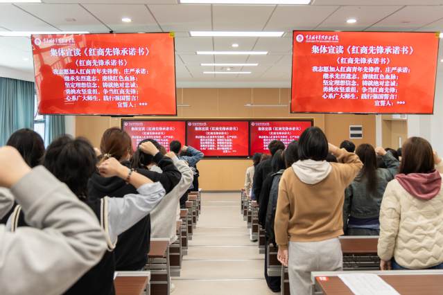 学生代表杨茜代表全体营员表态,将以实际行动传承红色基因、勇担时代重任。学院团总支学生书记聂心语带领全体成员郑重许下争当“红商先锋”的铮铮誓言。