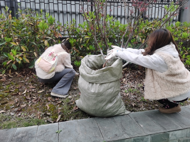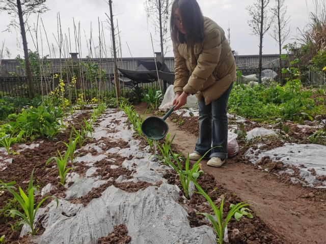 实践环节中,师生们分为4组,在“百合雅韵”“剑兰清风”“蔬香满园”三大种植区展开协作。翻土筑基环节,同学们挥动锄头破除板结土壤,细心清除石块杂草;播种环节,大家按照指导间距栽种象征纯洁的百合、寓意坚韧的剑兰、代表丰收的香芋及“紫气东来”的茄子苗,覆土后轻压固定;润泽新生环节,各组提水浇灌,遵循“不涝不旱”原则,见证生命萌芽的奇迹。随后师生共同捡拾树叶、杂草等制作有机肥。