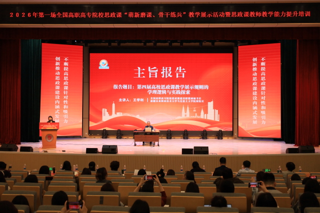 为深入学习贯彻习近平总书记关于思政课建设的重要论述,不断增强思政课的思想性、理论性和亲和力、针对性,4月11日,由全国高职高专院校思想政治理论课建设联盟主办、我校承办的2026年第一场全国高职院校思政课“萌新磨课、骨干练兵”教学展示活动暨思政课教师教学能力提升培训顺利举行。来自全国23个省、自治区、直辖市的110余所院校马克思主义学院的负责人、思政课骨干教师和青年教师代表300余人参加本次培训。重庆市委教育工委、重庆市教委宣教处处长李林齐,天津滨海汽车工程职业学院校长张泽玲,我校党委书记邹晓波等出席开幕式。开幕式由我校党委副书记莫堃主持。