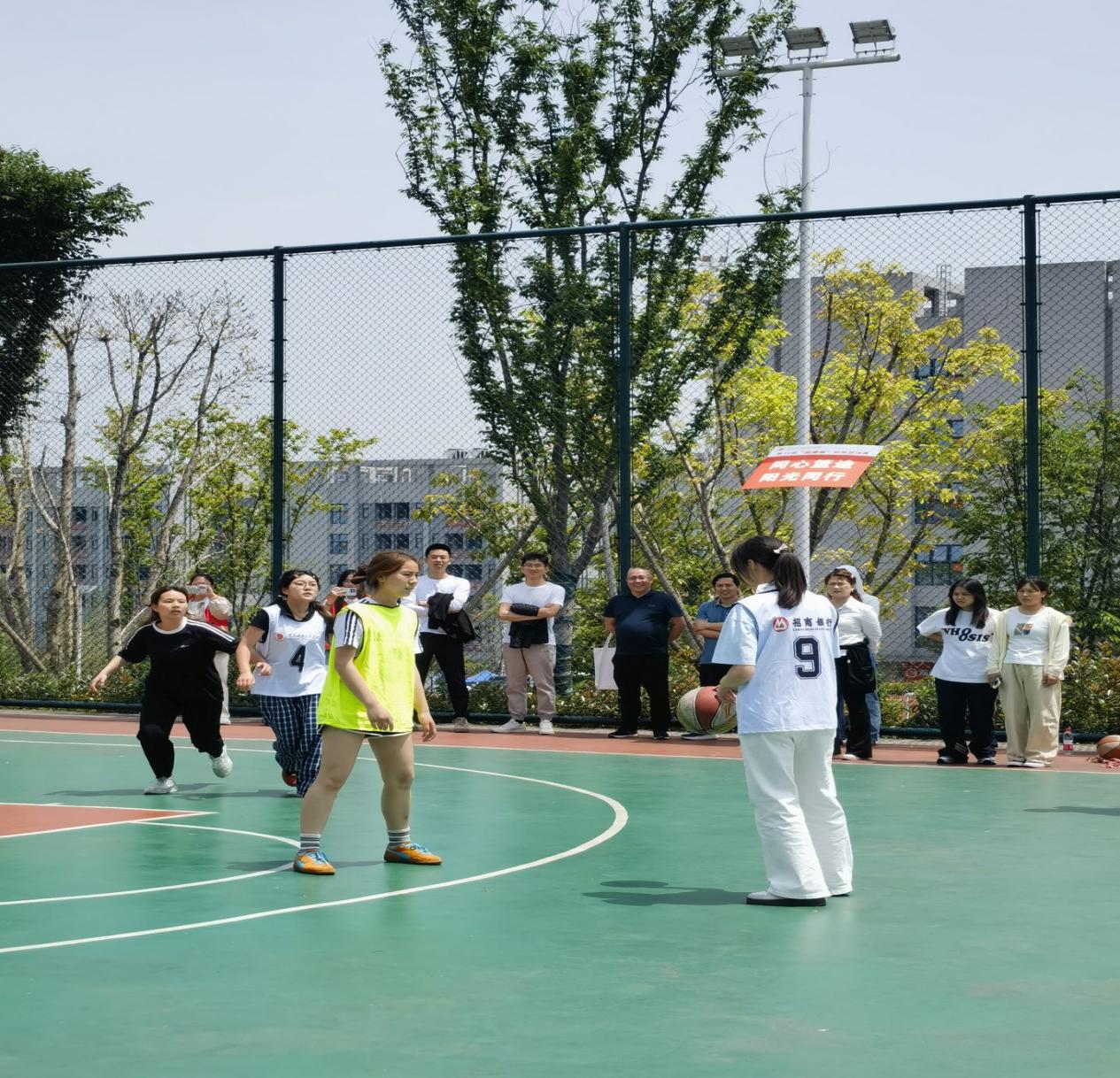 随后,蒋家宁一行来到校园篮球场,观看学院学生篮球赛并为参赛运动员加油鼓劲。赛场上,参赛学子精神饱满、斗志昂扬,配合默契、奋勇拼搏,充分展现了数智财经学院学子朝气蓬勃、团结协作、永不言弃的青春风采,最终男女两队双双获胜。比赛间隙,蒋家宁对同学们的良好精神风貌和团队凝聚力给予高度赞扬。