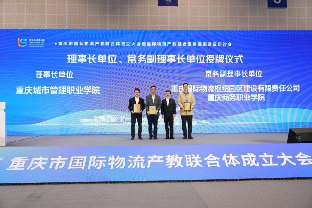 大会举行了理事长单位、常务副理事长单位及副理事长单位代表授牌仪式。陈德杰为理事长单位重庆城市管理职业学院,常务副理事长单位重庆国际物流枢纽园区建设有限公司、重庆商务职业学院授牌。