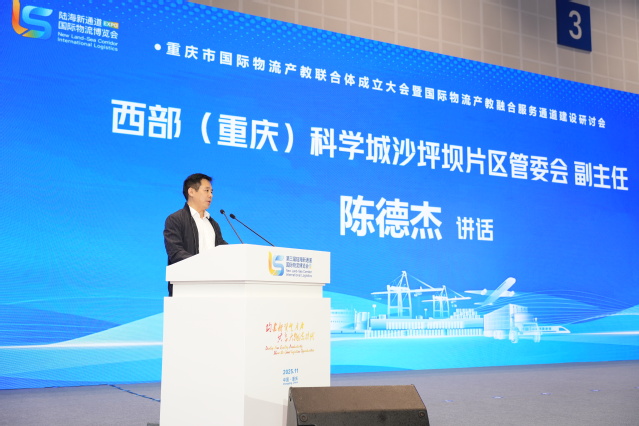 西部(重庆)科学城沙坪坝片区管委会副主任陈德杰发表讲话。他指出,建设市域产教联合体,是市委在社会民生和教育领域唯一明确“加快实施”的重大改革举措,是沙坪坝区深入贯彻落实市委决策部署的重要体现,也是推动产教深度融合、服务高质量发展的具体实践。作为园区主管部门,西部(重庆)科学城沙坪坝片区管委会将全力支持联合体建设发展。