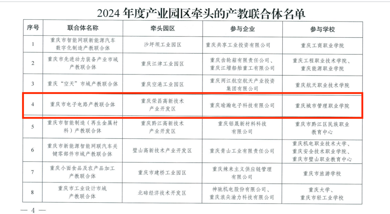 重庆市电子电路产教联合体由重庆荣昌高新技术产业开发区牵头,联合重庆瑜瀚电子科技有限公司等企业,围绕电子电路产业集群发展,通过实体化运作、项目化推进,构建 “产学研用” 一体化育人模式,为荣昌区电子信息制造业提供人才支撑和技术保障。2024年12月,学校牵头召开联合体工作推进会,明确实体化运行机制,分解“技术攻关、课程共建、师资互聘” 等重点任务,推动电子电路产业技术创新与人才培养良性互动。