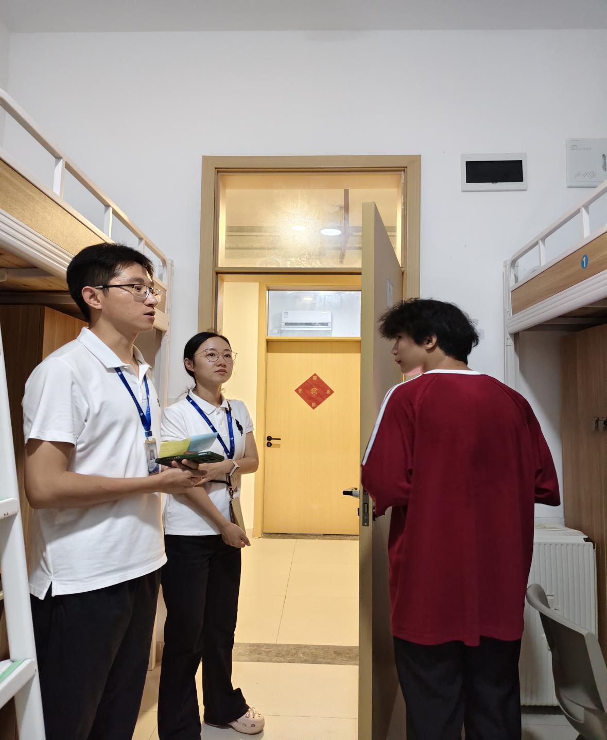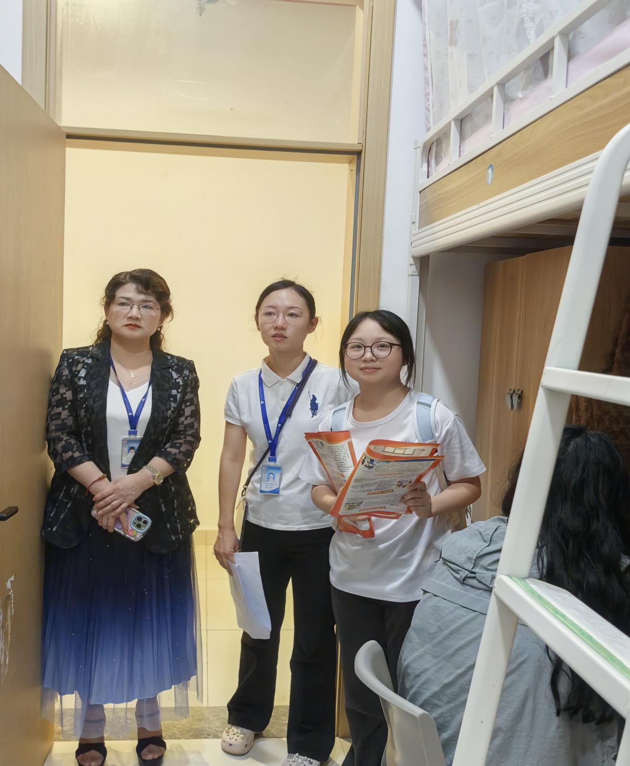 走访过程中,老师们亲切地和同学们询问生活日常点滴,细心询问“宿舍住得习惯吗?”“有没有遇到什么困难?”,耐心倾听、一一回应。同学们也渐渐打开心扉,和老师分享住宿的感受和生活的小故事。欢声笑语不时从寝室传出,气氛格外温馨。每一间宿舍老师们都不忘叮嘱大家注意用电和财产安全、谨防诈骗等,并为每间宿舍分发了一份安全资料,希望同学们认真学习,保护好自己。